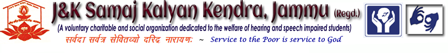Jammu and Kashmir Samaj Kalyan Kendra, Jammu is a well-known voluntary, Social & Charitable Non-Governmental Organization of the State registered on 24th October, 1980 with the thrust area of uplift and empowerment of hearing and speech handicapped boys and girls of J&K State through formal and vocational education. Dr R. R Khajuria, a noted social activist of the State founded and nurtured it with his untiring efforts for many years towards establishment of the organization on sound footing. The NGO is running a School for hearing handicapped and providing absolutely free education to over 110 such specially talented students up to 12th class with some vocational training. J&K Samaj Kalyan Kendra is a well known voluntary social charitable Non Governmental Organization registered on 24th October, 1980.(Under J&K Societies Registration Act, under No 604-S of 1980 ) with the thrust activity of area of uplift and empowerment of physically challenged children, particularly the hearing and speech handicapped boys and girls of the State through formal and vocational education; besides other allied social and charitable activities. An appreciable number of distinguished citizens , including retired Central and State Government Officers, with zeal for social service have been supporting the Organization through voluntary service and donations. Dr. R. R. Khajuria, a noted social activist of the State, was the Founder President of the Kendra who rendered his untiring voluntary services for many years towards establishment of the Organization on sound footing. He continues his valuable services as the Patron of the Kendra. In pursuance of the aforesaid objective, the Organization has been successfully running a free school for the deaf and dumb children since 1981. The first ever Primary School for Deaf and Dumb was inaugurated by Mohtrama Beum Sheikh Abdullah on 19-04-1981 in a small accommodation of a temple complex at Jammu. In stages, the school has been upgraded to Secondary School level since 1995-QB. Senior Secondary classes have since been started in the School from session 2012-13 in coordination with Maharaja Hari Singh Higher Secondary School Jammu under special provision by Directorate of School Education, Jammu. The institution was shifted to the present spacious premises of Evacuee Property allotted on rental basis in July 1986 from Geeta Bhawan Complex, Jammu. The Kendra has been providing free education, formal and basic vocational, to all the hearing & speech impaired students of the school. The school is named as J&K Samaj Kalyan Kendra Secondary School for Hearing Handicapped . The school is centrally located in the heart of Jammu City at Shahidi Chowk, Jammu (Behind Radha Swami Satsang Bhawan). Classes for 11th class have been started from 2012-13 session with cooperation of Department of Education, J&K. Admission to 12th class for subsequent sessions has also been provided. Formal orders for up gradation of the school to Higher Secondary level are expected in due course. The school is duly recognized by the J&K State Government and affiliated with the J&K State Board of School Education , Jammu. His Excellency the Governor of Jammu and Kashmir State is the Patron-in -Chief of J&K Samaj Kalyan Kendra and all the surviving past presidents render their valuable advice and help as Patrons. A select panel of Advisors to the Organization has also been empanelled after seeking their concurrence. The panel comprises prominent personalities including Shri S. S. Wazir, IPS, Retd. Addl. Director General of Police, Shri Pem Gupta, IPS Retd. IGP Police, Shri P. P. Sharma, IFS Retd. Principal Chief Conservator of Forests, Shri B. K. Raina, Retd. Director Geological Survey of India.